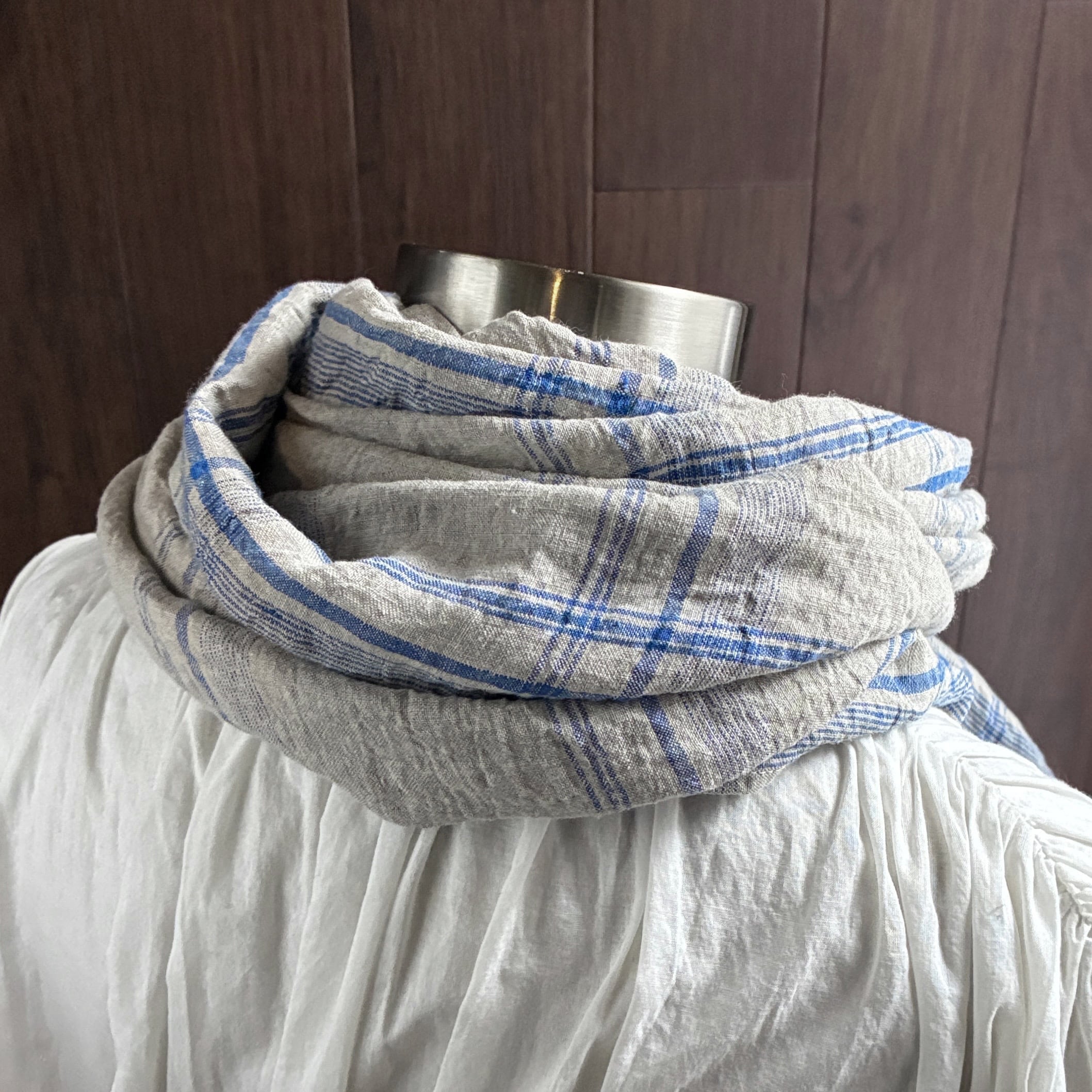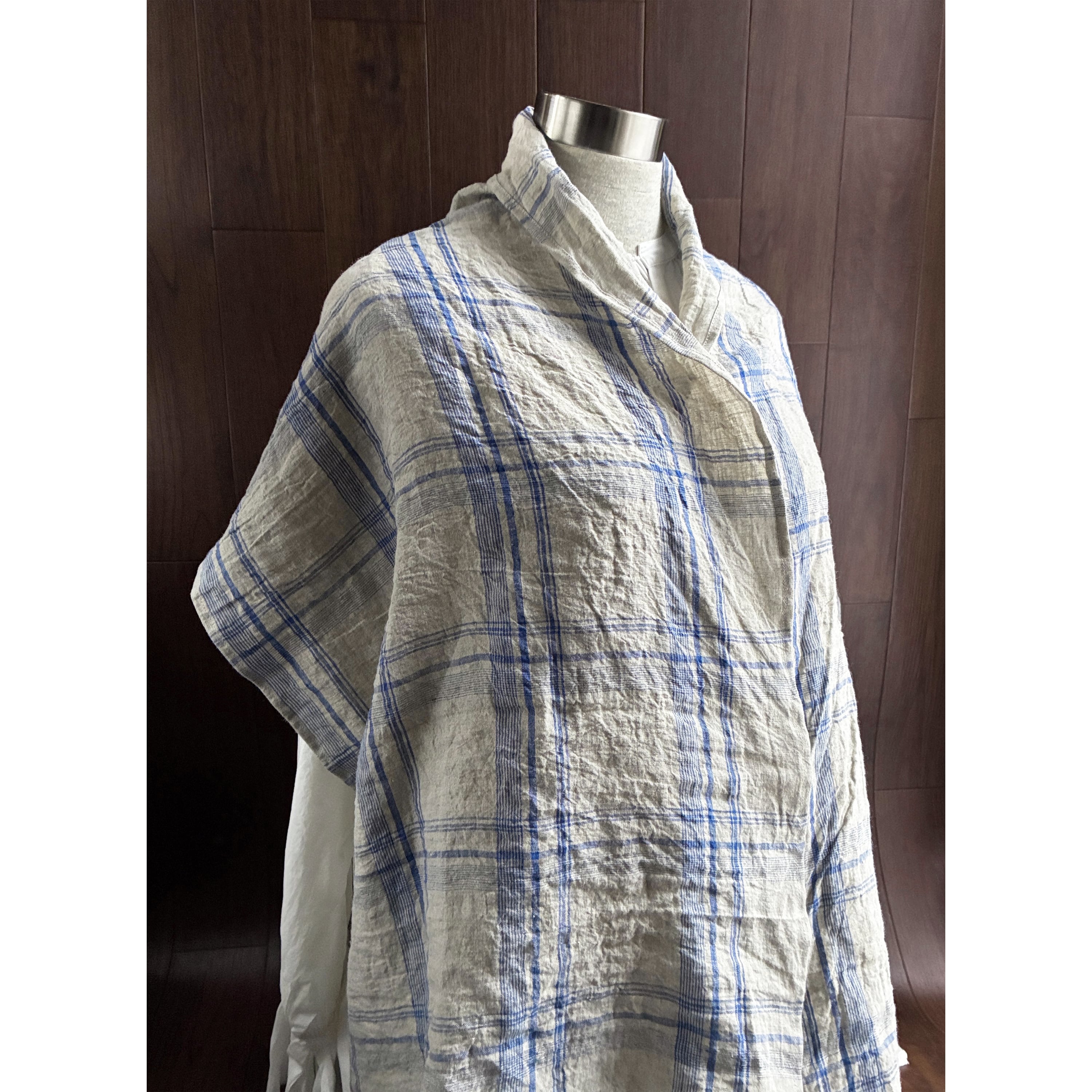 東炊き リネンのストール チェック 亜麻色×ブルー
