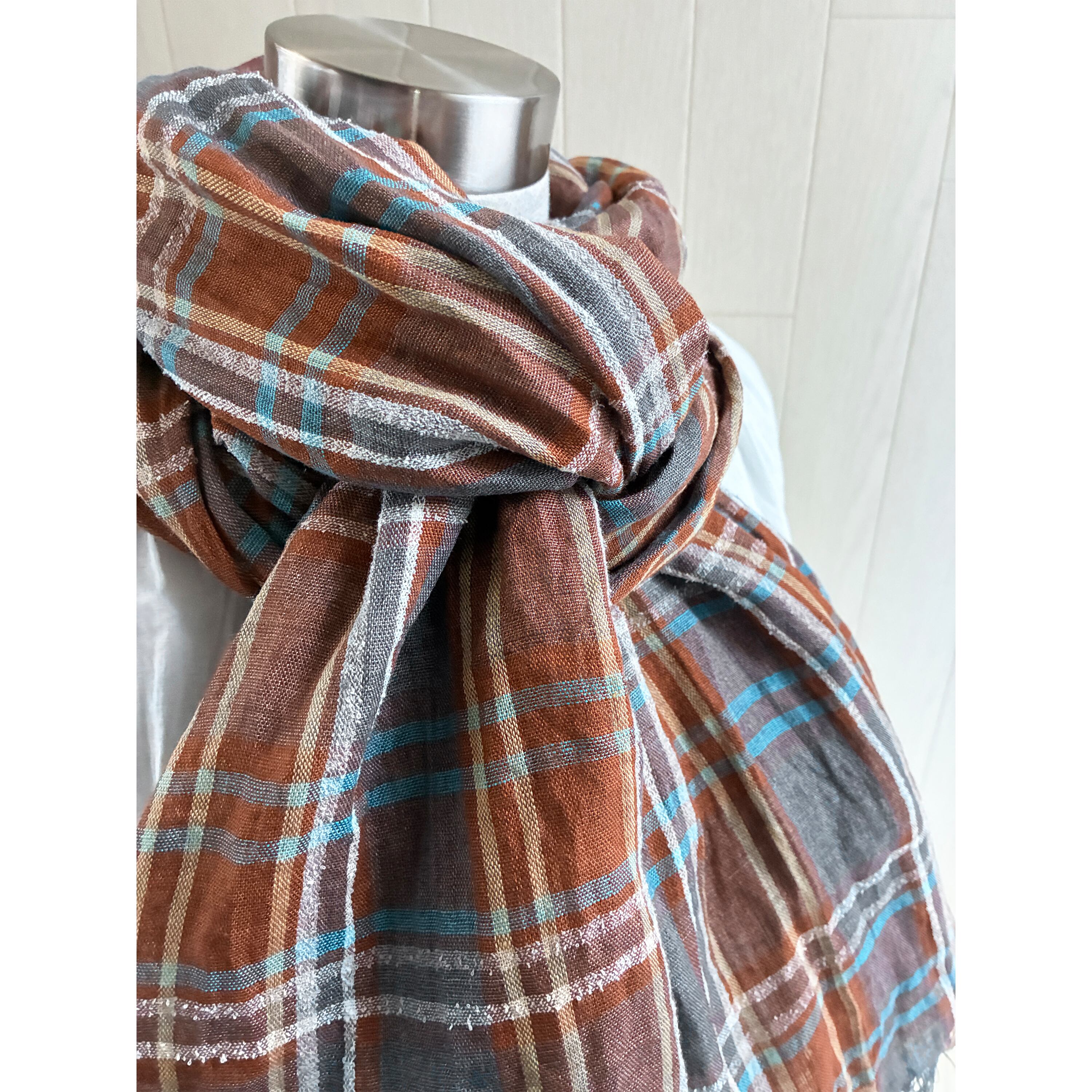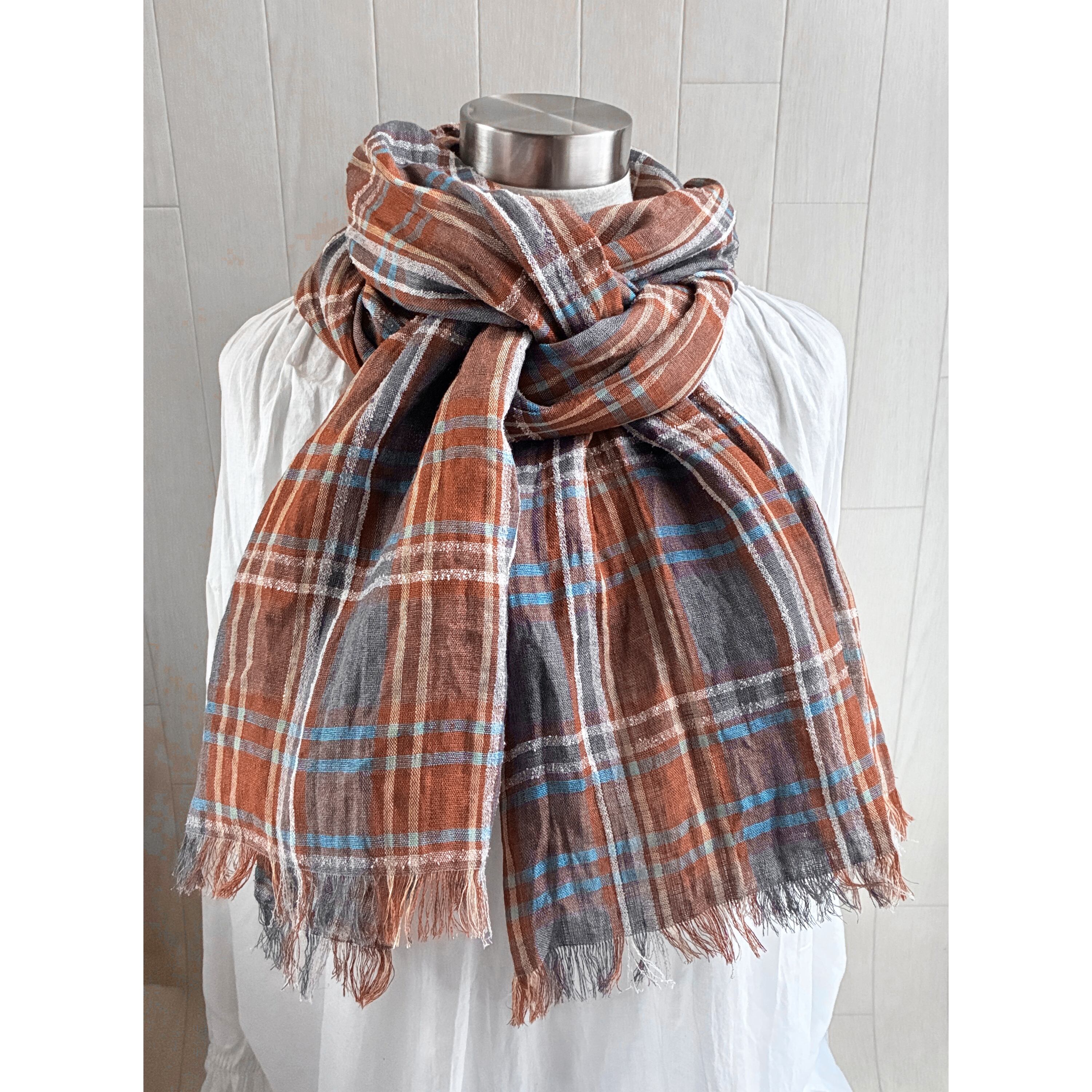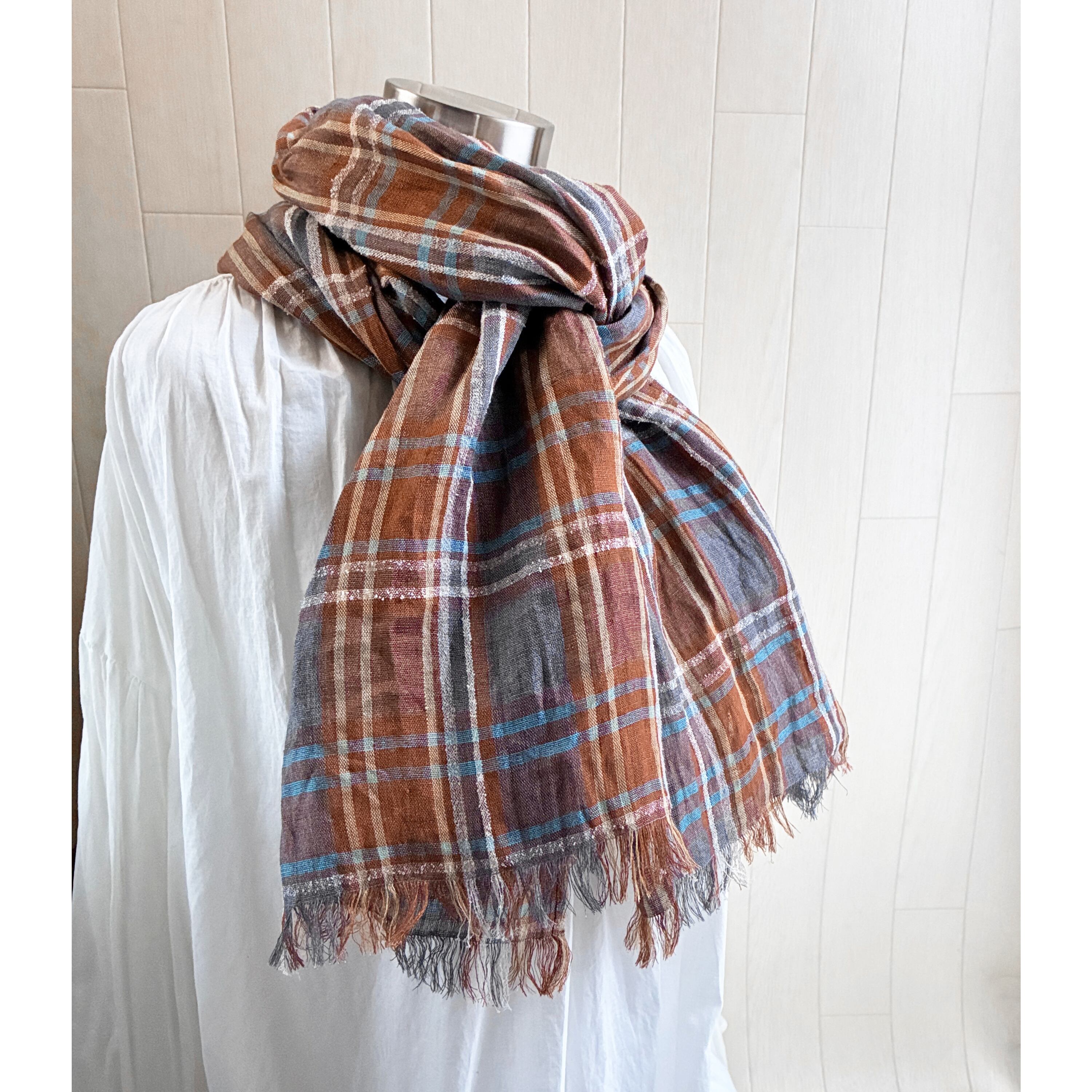 イタリアンリネンのストール チェック キャラメルブラウン×グレー系