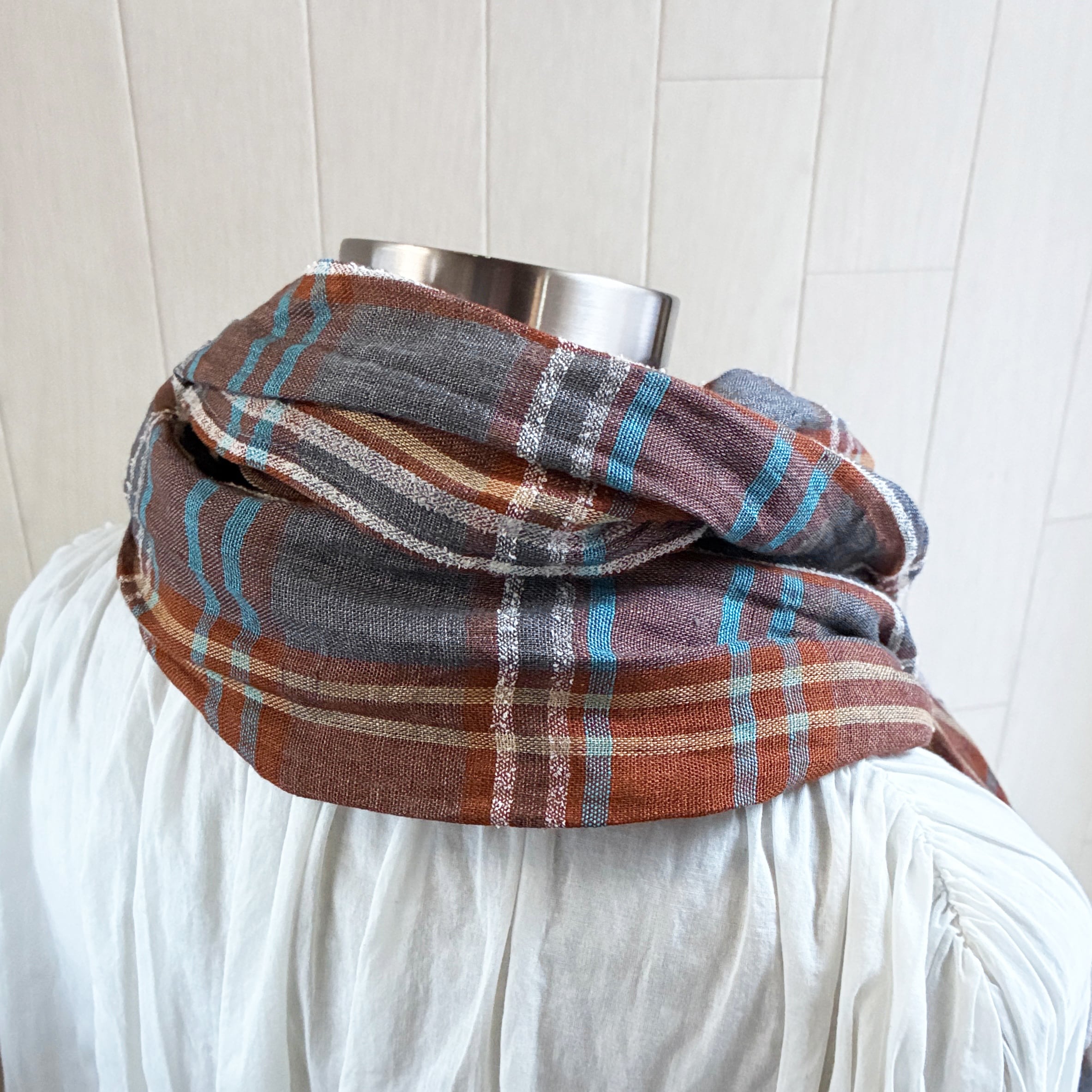 オレンジブラウンとグレーに、ターコイズブルー、くすみイエロー、白のラインが入ったチェックです。