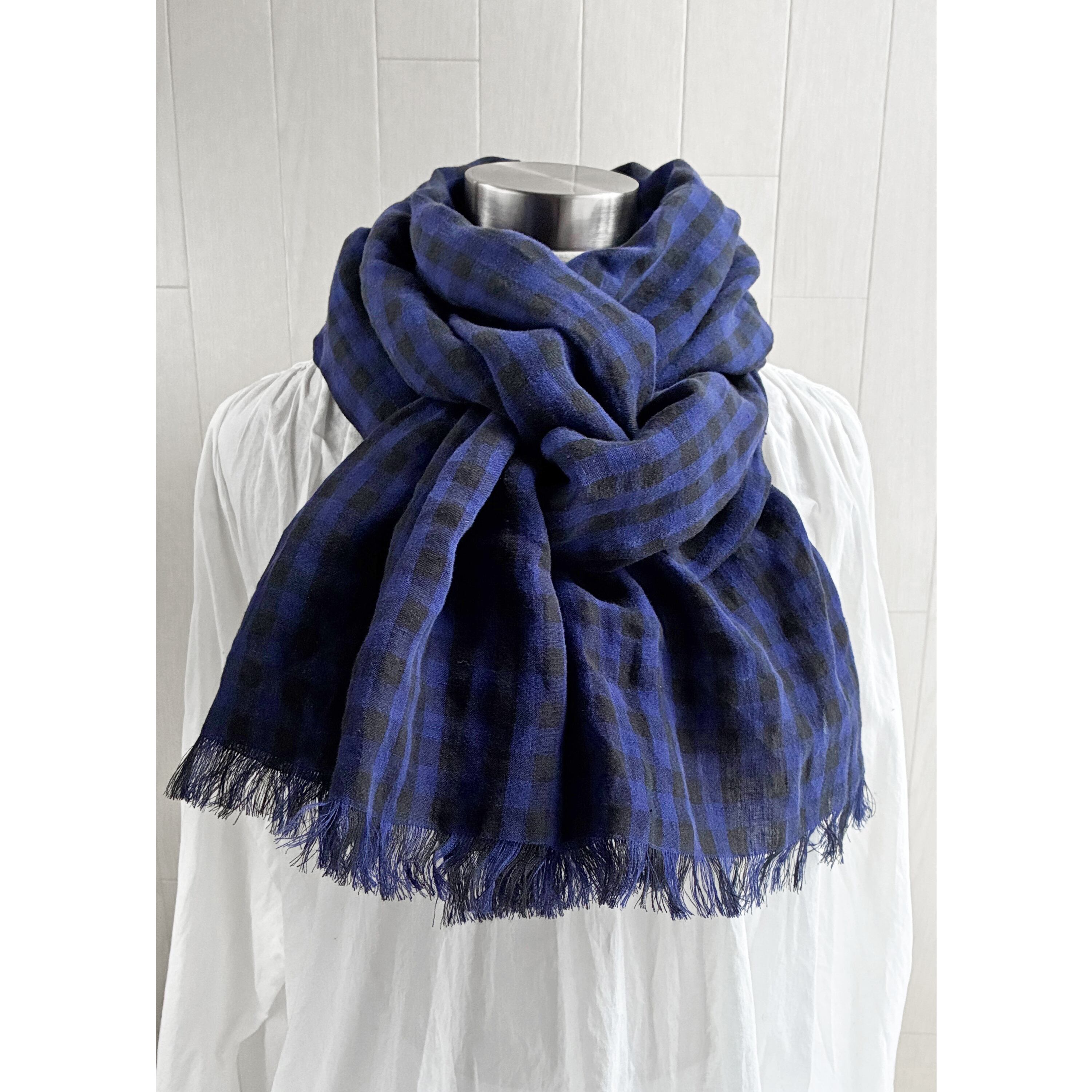 イタリアンリネンのストール ギンガムチェック ブルー×黒